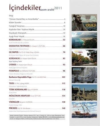 Bu mücadelelerin en önemli unsurlarından biri olan korsanları Kilikya’dan Atlantik Okyanusu’na kadar takip ettik. Kötü ünü kendilerinden önce kıyı kentlerine ulaşan bu deniz savaşçılarını, ilk ortaya çıktıkları dönemlerden 18. yüzyıla kadar; tüm yaşam biçimleri, kültürleri, saldırıları, saldırılarının sebepleri ve sonuçları ile birlikte anlatmaya çalıştık. Olympos’un ünlü korsanı Zeniketes’ten, Kanuni Sultan Süleyman’ın Deniz Beylerbeyi Barbaros Hayreddin Paşa’ya kadar adını denizlere yazmış olan en önemli korsanları bu sayımızda konuk ettik.
