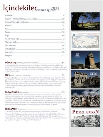 Büyükelçi Gürcan Türkoğlu ile kültürel miras ve koruma politikaları üzerine yapılan röportajda; dünya mirası kavramı, Türkiye’de kültürel miras anlamında koruma bilinci ve duyarlılığının artışı, tüm dünyada şehirleşme, sanayileşme, ihmal, savaş, doğal afetler ve hatta kötü yönetimden kaynaklı olarak dünya miras alanlarında ortaya çıkan tahribatlar ele alınıyor. Dünya Mirası Geçici Listesine henüz dahil edilen varlıklarımızdan, evrensel bir kent ve hükümdarlık tarihinin temel taşı olan Hellenistik krallık merkezi Bergama; Neolitik Dönemden Orta Çağa kadar uzun bir yaşam süren ve insanlık tarihinin tüm aşamalarına ait kalıntıları içinde barındıran Efes ve gözü pek savaşçıların kenti Pisidia’nın imparatorluk kültü merkezi olan Sagalassos, tarih içinde büyüyen kültürel çeşitliliği ve bununla ilişkili mimari yapı topluluğu ile birlikte sunuluyor.